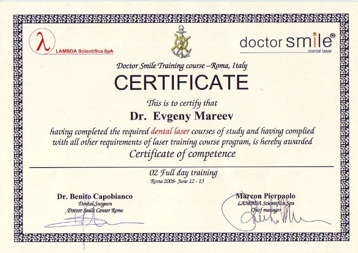 Сертификат подтверждает, что Мареев Евгений, врач-стоматолог, консультант по стоматологическим лазерам компании GREEN DENT, успешно прошел обучающий курс по применению лазеров Dr. Smile от компании Lambda S.p.A. в стоматологии.