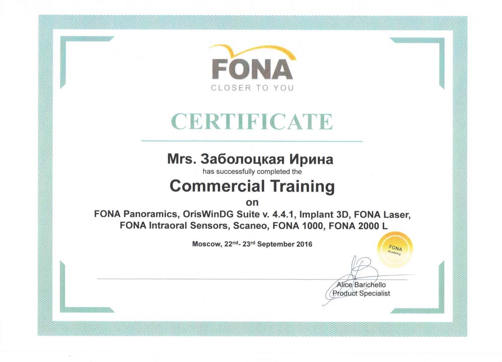 Руководитель сервисного отдела компании  «ГРИН ДЕНТ», Заболоцкая Ирина, успешно прошла тренинг по оборудованию FONA.
