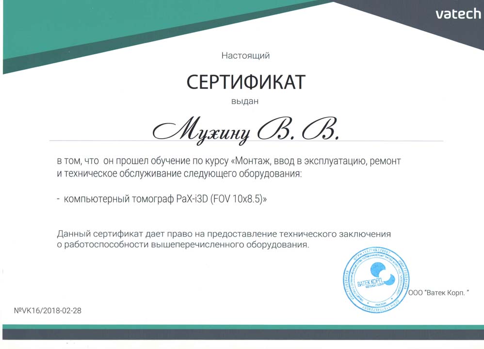 Сертификат авторизованного сервиса-центра Vatech