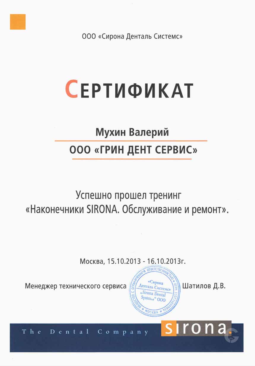 Инженер компании ООО «ГРИН ДЕНТ СЕРВИС», Мухин Валерий Владимирович, успешно прошел тренинг по ремонту и обслуживанию наконечников SIRONA.